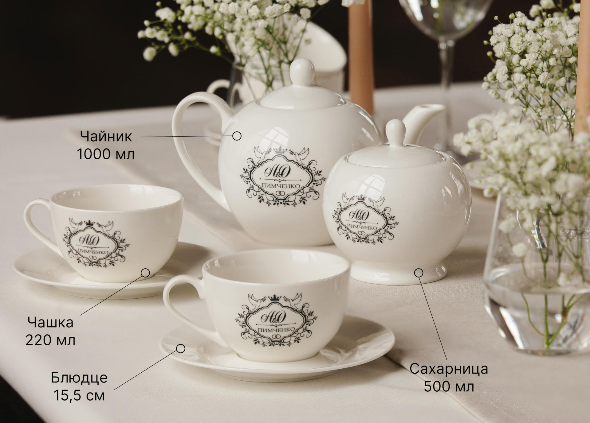 По вашему желанию на отдельные предметы могут быть нанесены различные надписи и рисунки, в том числе печать предоставленных вами изображений, при наличии технической возможности. На второй стороне чашки или чайника также может быть размещено дополнительное изображение.